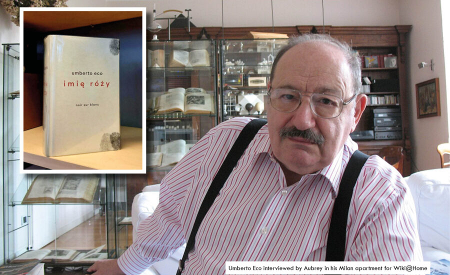 Umberto Eco (1932-2016), włoski bibliofil, powieściopisarz, autor felietonów i esejów - gościł w Łodzi na uroczystości nadania mu tytułu doctora honoris causa Uniwersytetu Łódzkiego. Pobyt miał miejsce w dniach 22-26 maja 2015 r.