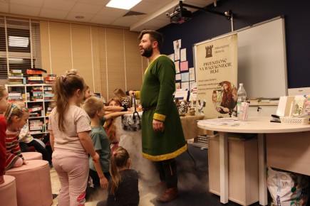 Ostatni listopadowy Literacki Podwieczorek wypełniony był wróżbami i opowieściami o dawnych ludowych zwyczajach związanych ze świętem Katarzynek i Andrzejek. Ponownie naszymi przewodnikami po historii i dawnych zwyczajach byli pani Sylwia i pan Wojciech z firmy „Pokazujemy Historię – archeologiczne warsztaty i pokazy średniowieczne”.