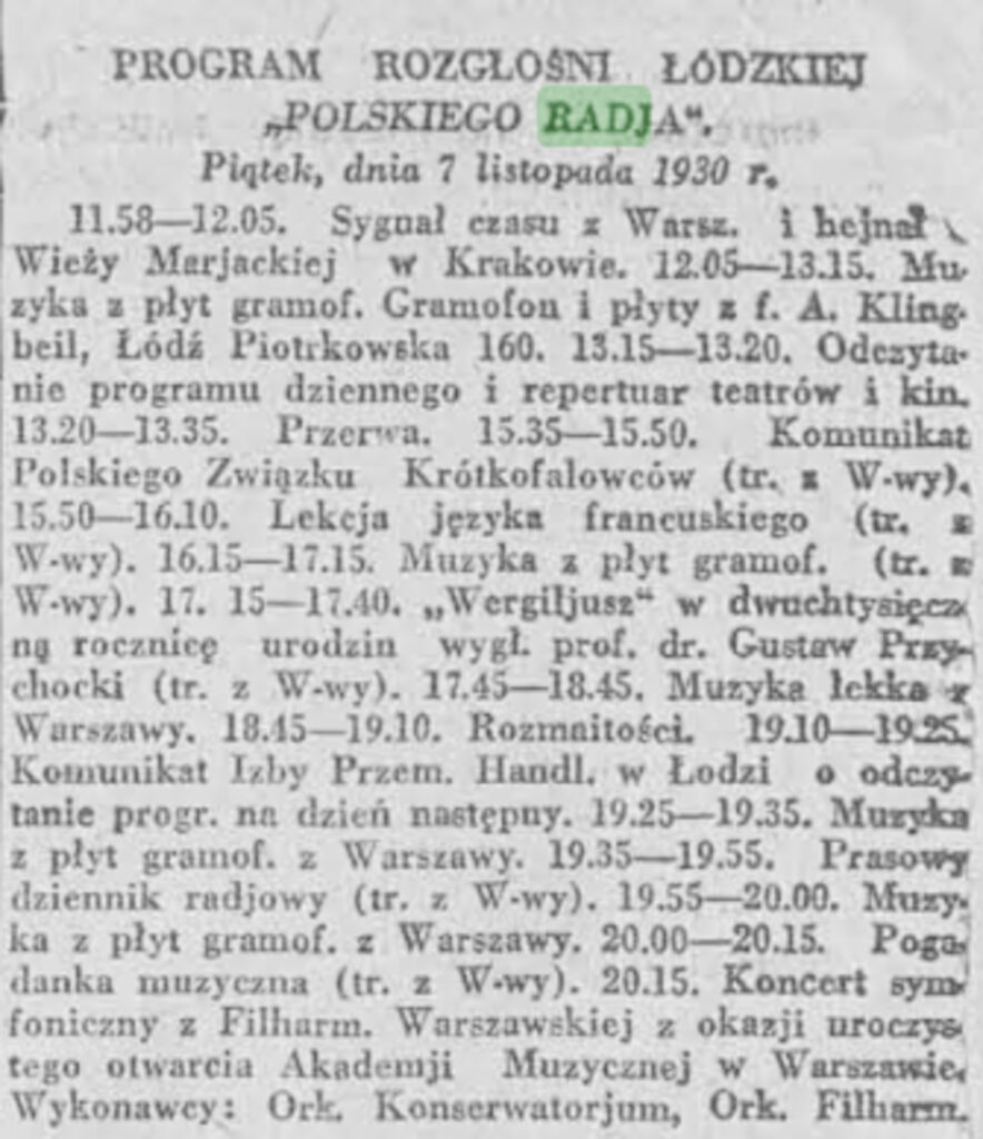 Jaki program rozgłośnia łódzka nadawała w listopadzie 1930 r.? Sygnał czasu z Warszawy i hejnał z Wieży Mariackiej w Krakowie, odczytanie programu dziennego i repertuaru kin i teatrów, muzyka z płyt gramofonowych, rozmaitości, lekcje języka francuskiego pogadanki muzyczne i wiele więcej.