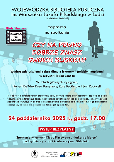 Klub Filmowy „Klatka po klatce” zaprasza na spotkanie pt. „Czy na pewno dobrze znasz swoich bliskich?”, które odbędzie się 24 października 2025 r. o godz. 17.00 w sali konferencyjnej Wojewódzkiej Biblioteki Publicznej w Łodzi.
