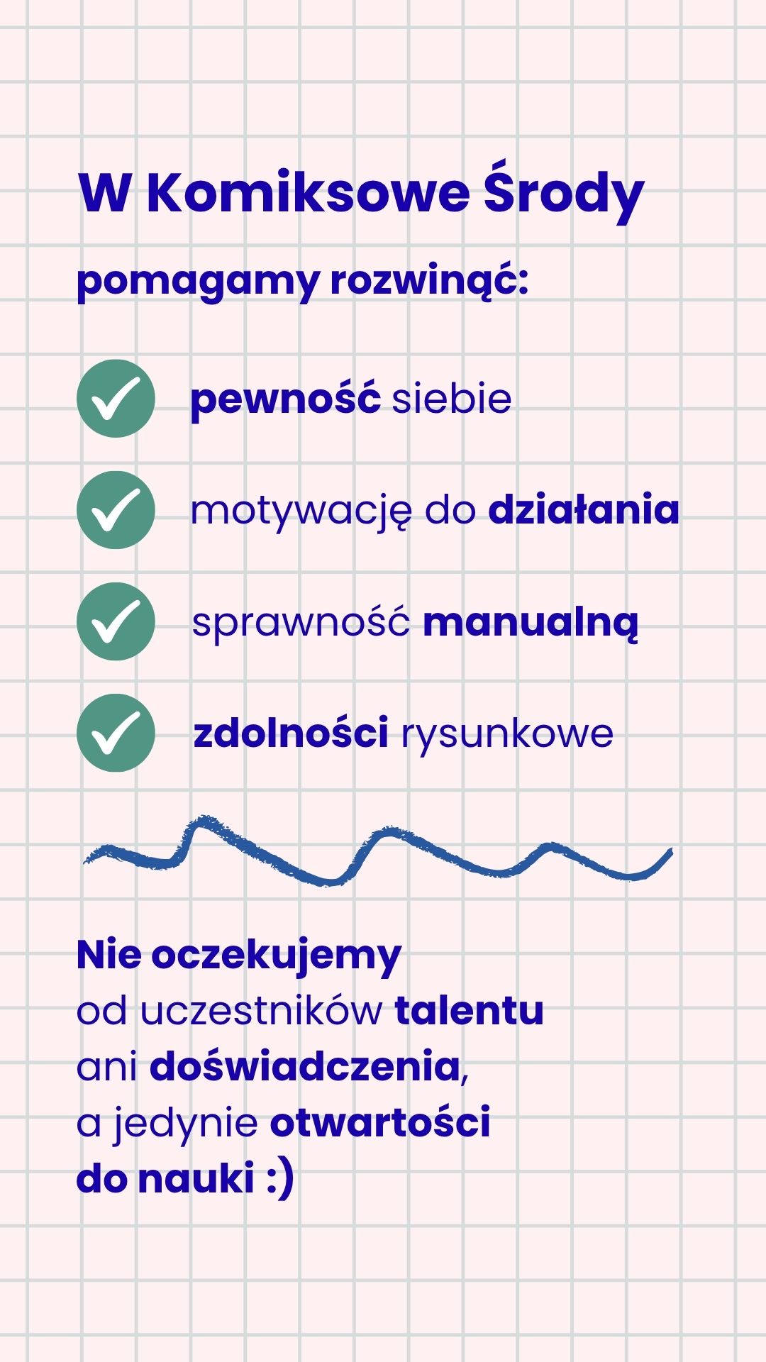 Zapraszamy dzieci w wieku 7-13 lat, pełne pomysłów i dobrej energii! Pomożemy zadbać o pewność siebie i motywację do działania, a przede wszystkim – rozwiniemy zdolności rysunkowe i sprawność manualną.